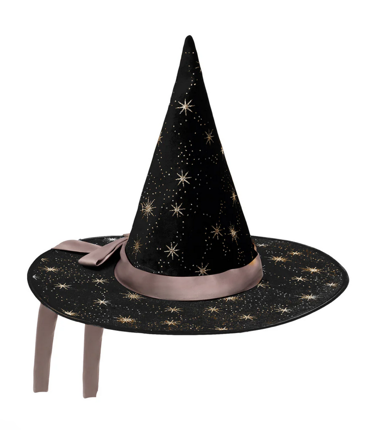 Cast a spell in style this spooky season with our Agatha witch hat! This wonderful hat with its classic witchy silhouette and spectacularly starry print is sure to add a fancy flair to any costume. Pair with our matching Aurora cape, tutu or wand to complete the look!