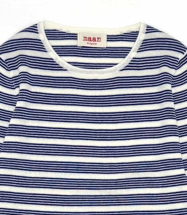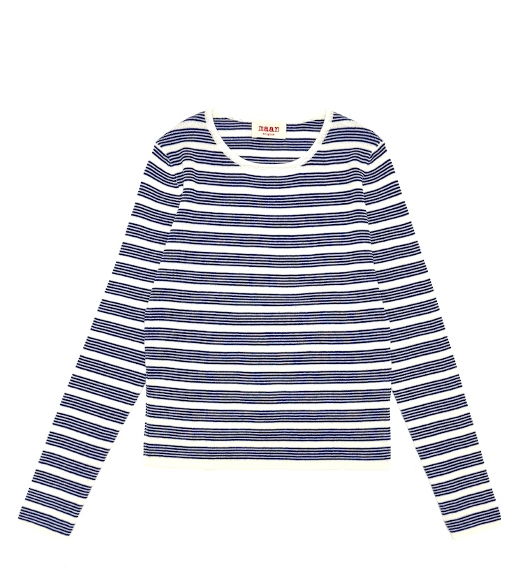 Super-soft, long-sleeved, close-fitting, striped knit shirt with a round neckline.