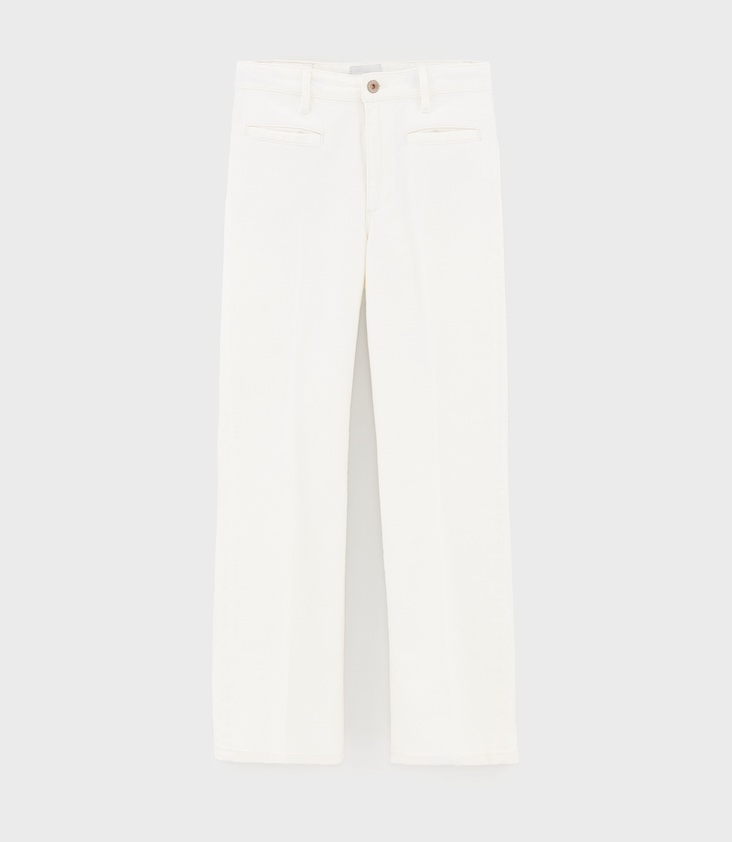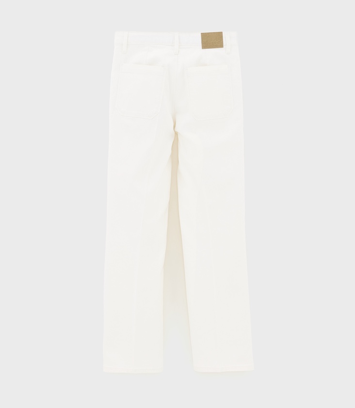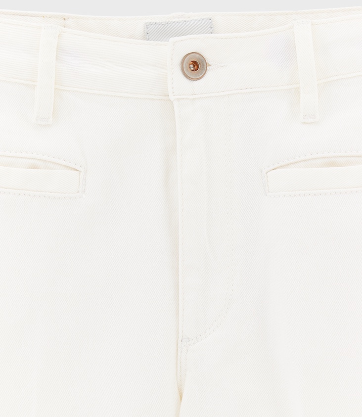 Straight-cut jeans with front slit pockets and patch pockets at the back, adjustable waistband.