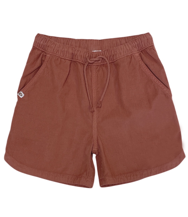 Short corduroy shorts with front pockets, back pockets, and elastic waistband with drawstring.
