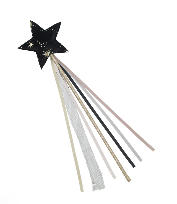 Beautiful wand with padded star, printed with star motif, matching the Agatha cape, witch`s hat and tutu. With different coloured ribbons and glitter stick.
