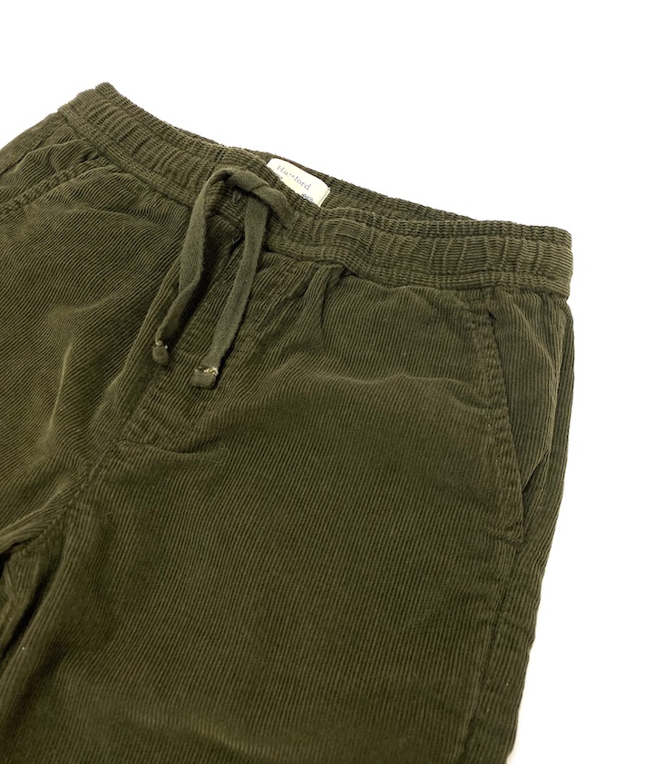 Corduroy gym pants in cotton. Elasticated waistband and self-tie cotton cord. Two side pockets and two buttoned piped pockets on the back.