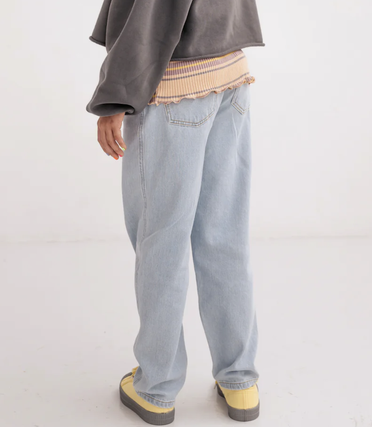 5-pocket jeans made from recycled cotton denim are tapered at the legs and have an adjustable, elasticated waistband.