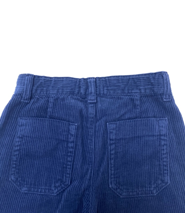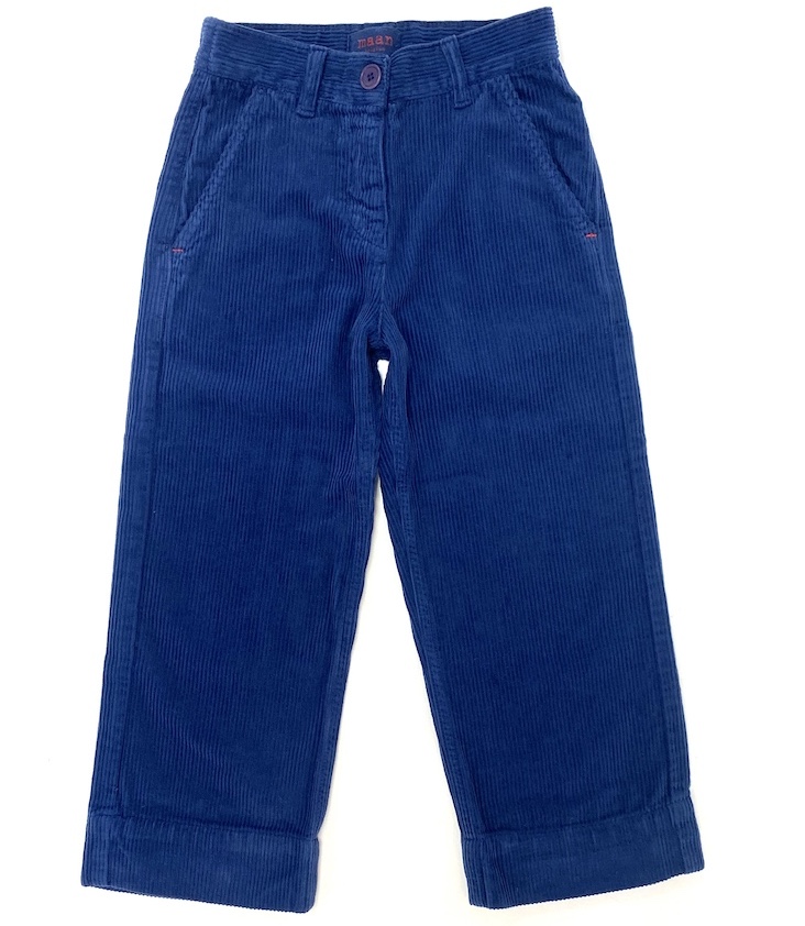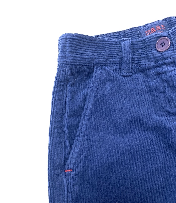 Straight-cut Manchester trousers, with side slit pockets and sewn-on pockets at the back, adjustable waistband