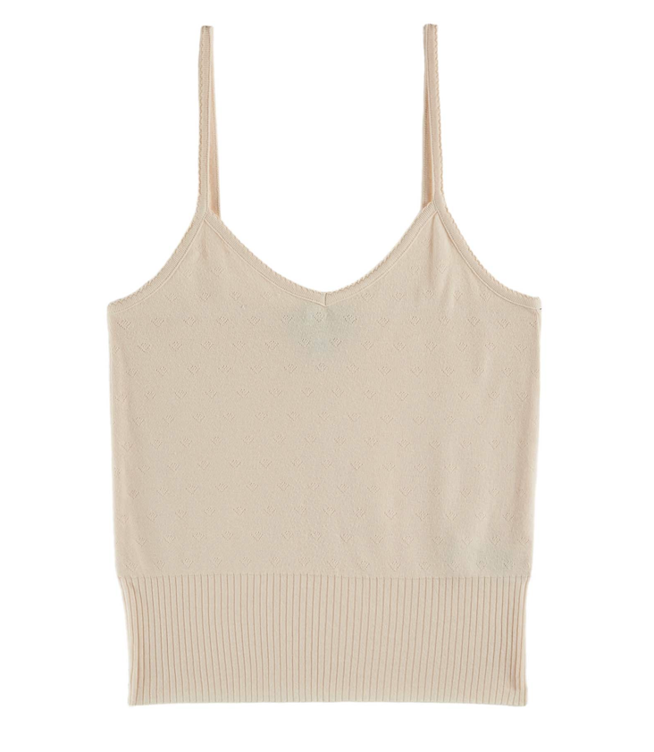 Cotton and modal jersey top. The particularity of the pointelle knit is that the openwork stitches in the knit form a fine, repeating pattern, giving it a soft, romantic feel. The base of the tee is knitted in ecru ribbing and the slender straps are ribbed.
