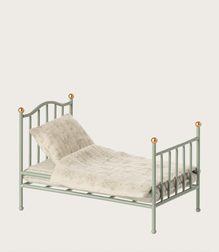 Vintage bed for a mouse, with mattress, blanket and pillow