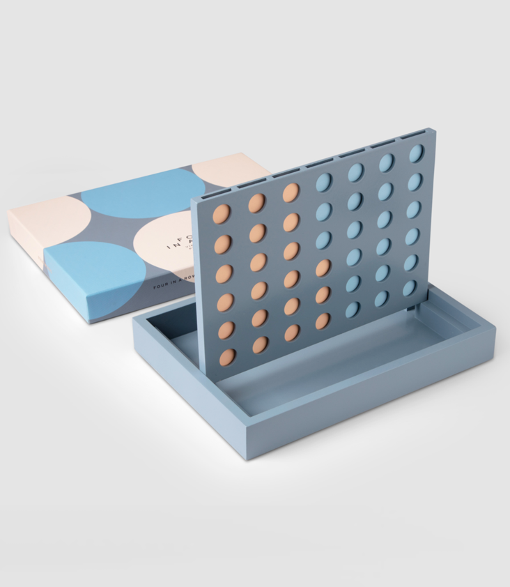 Das Spiel ist komplett aus lackiertem Holz gefertigt, einschliesslich der 42 Spielscheiben (21 von jeder Farbe) mit einer stabilen Konstruktion, die sich zu einem kompakten Spiel zusammenfalten lässt, wenn es aufbewahrt wird. Dieses Vier Gewinnt wird mit einer leicht verständlichen Anleitung in Deutsch, Englisch und Französisch geliefert.