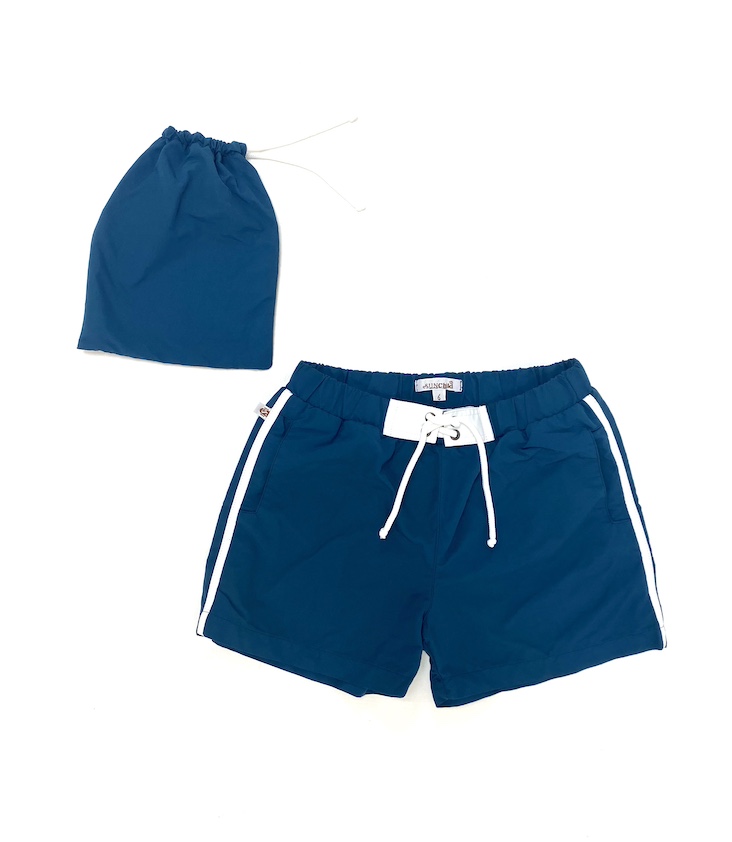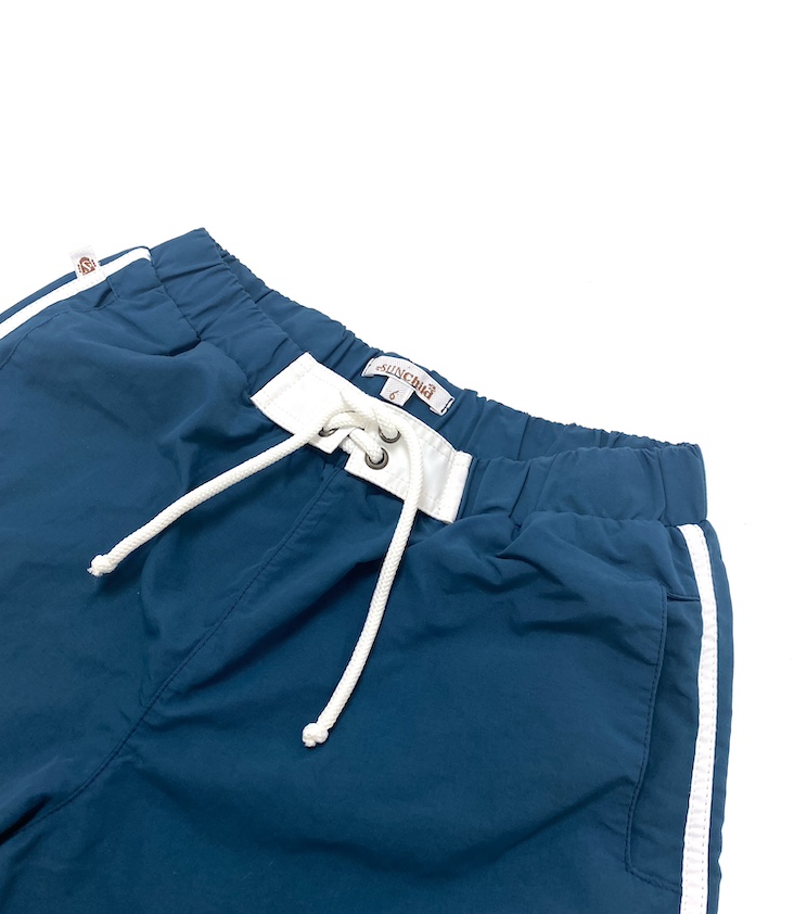 Längere Badeshorts mit elastischem Bund und Tunnelzug. Vorne am Bund kontrastfarbener Einsatz mit Schnürung. Mit Eingriffstasche und mit einem integriertem Mesh Slip. Weisser seitlicher Streifen.