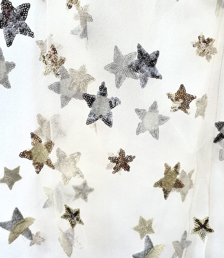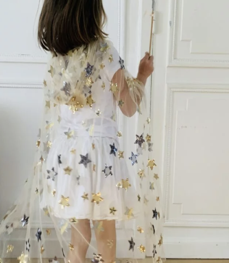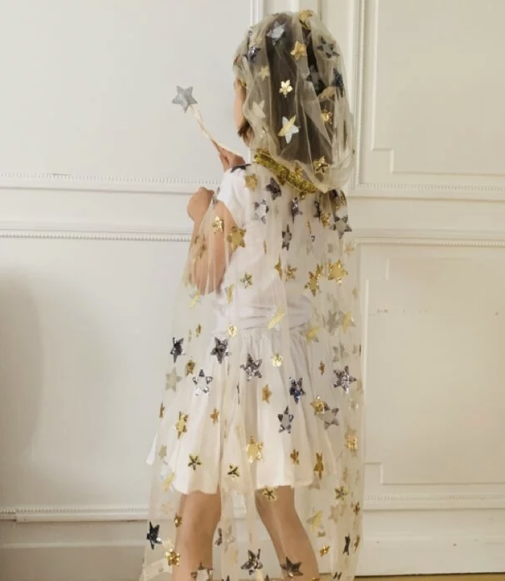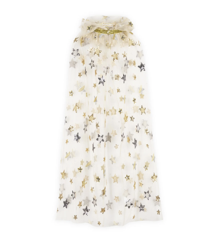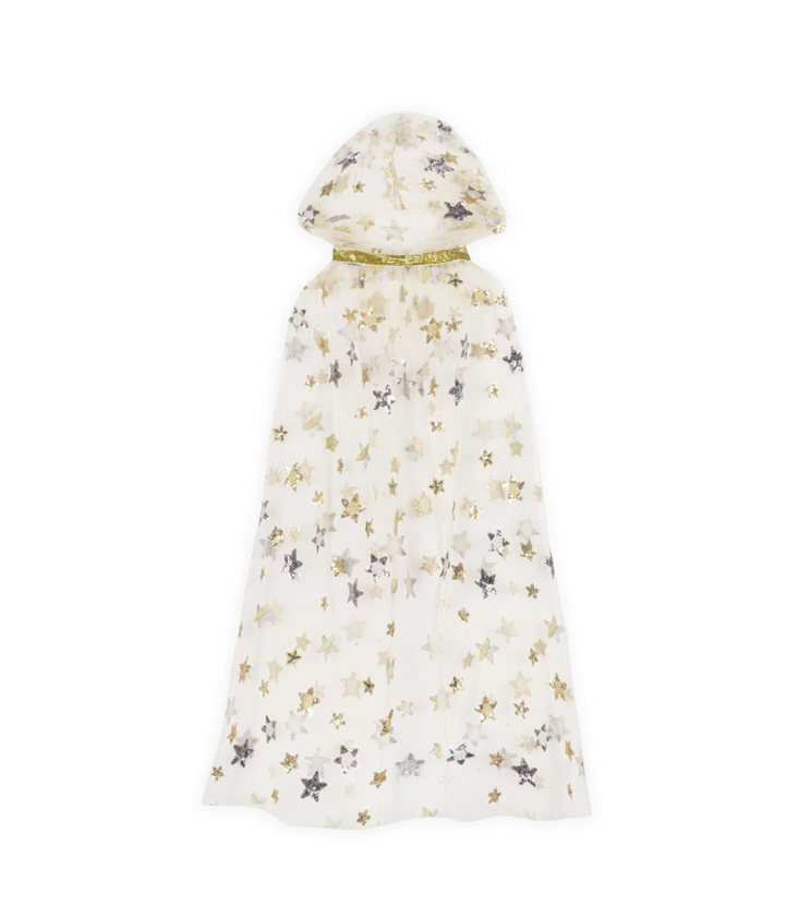 Mit goldenen und silbernen Pailletten-Sternen bestickter Umhang mit Kapuze aus Tüll