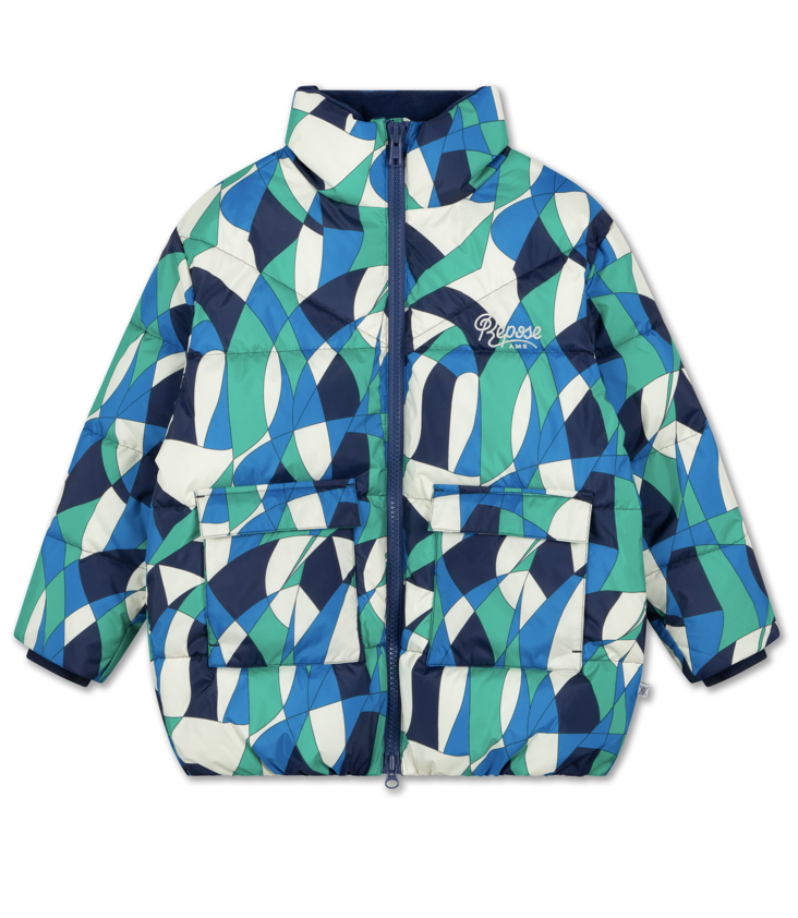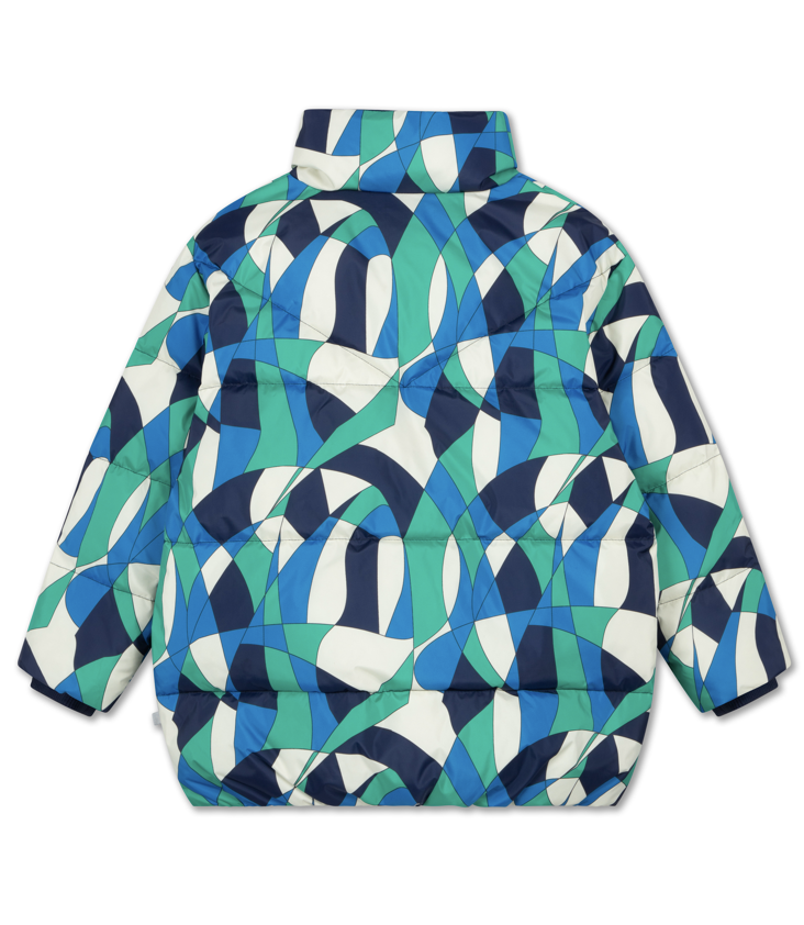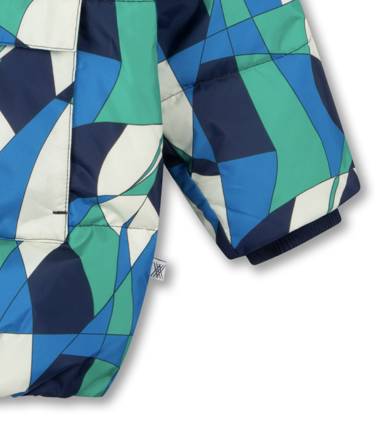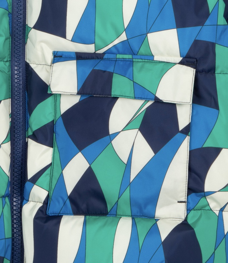 Warm gefütterte, mehrfarbige gesteppte Winterjacke mit Farbverlauf. Hoher Kragen - inwendig mit Fleece. Der elastische Saum, die gerippten Ärmelbündchen und der Reißverschluss am Hals bieten guten Schutz vor Kälte. Zwei Fronttaschen und eine Innentasche. Grobe, doppelte Reißverschlüsse und gesticktes Logo am linken Ärmel.