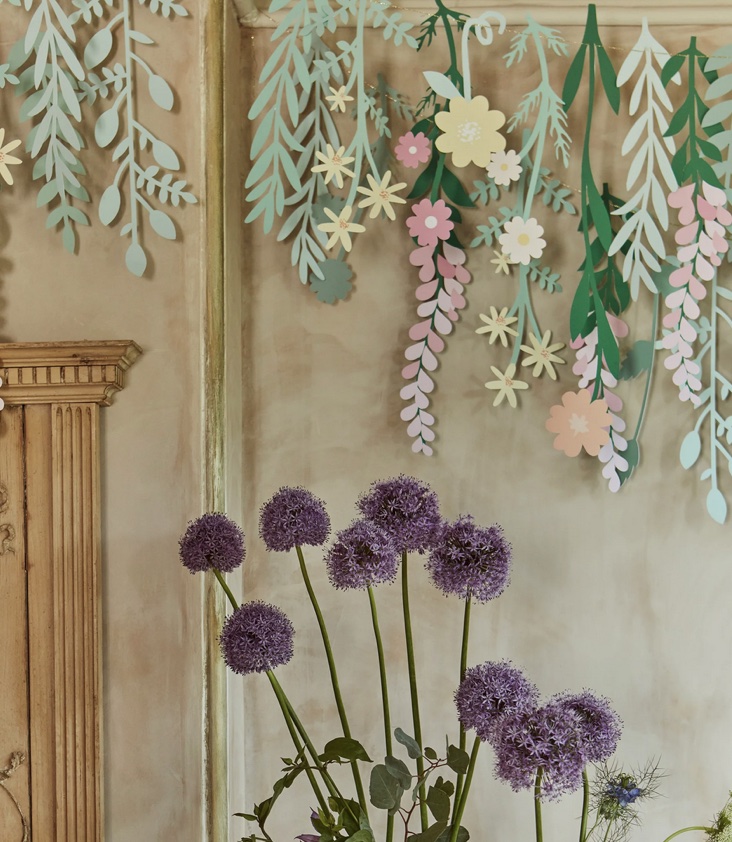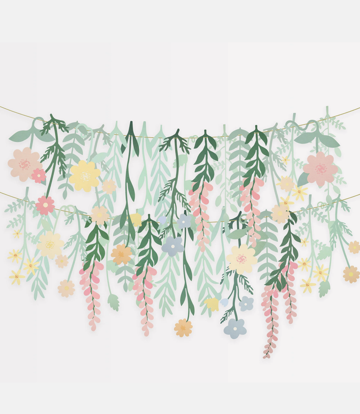 Girlanden-Vorhang mit Papierblumen und Blättern, mit goldener Matallic-Kordel