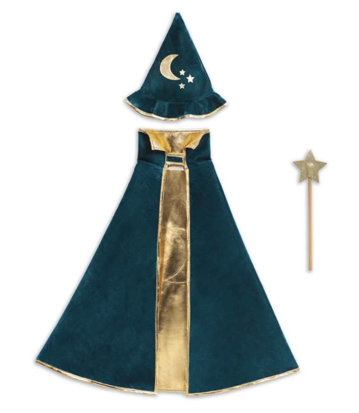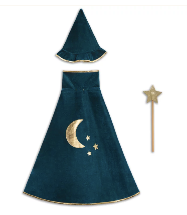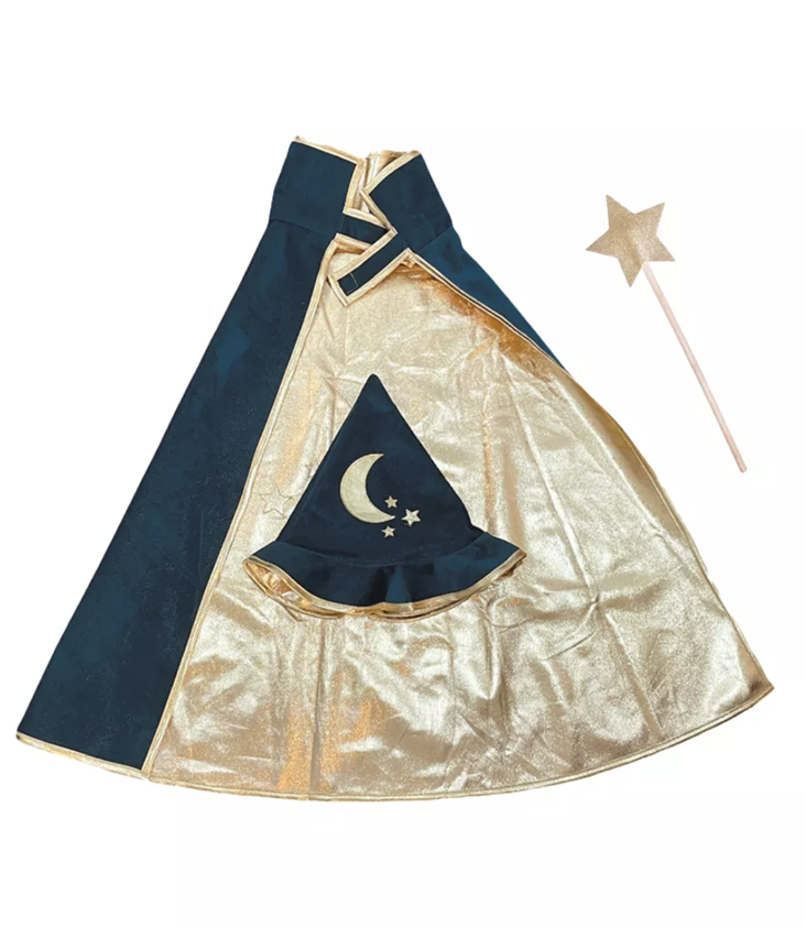 Set aus Zauberer Umhang und Hut mit Mond/Sternen Motiv. Inkl. Zauberstab aus Holz mit Glitzer-Stern. Umhang mit Klettverschluss.