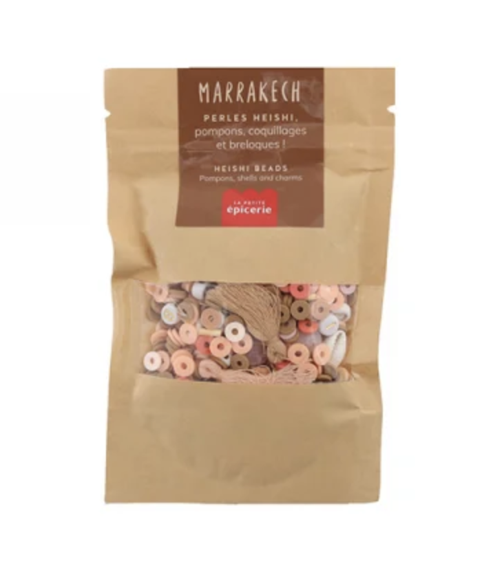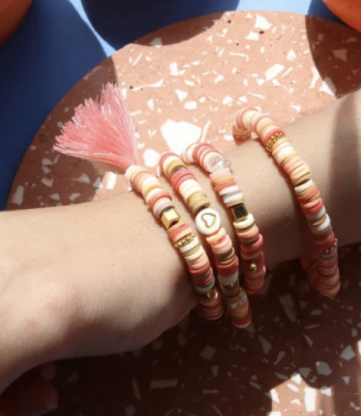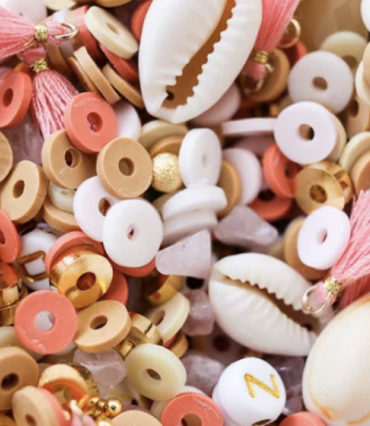 Set von bunten Heishi Perlen inkl. Pompons, Muscheln und Anhängern.