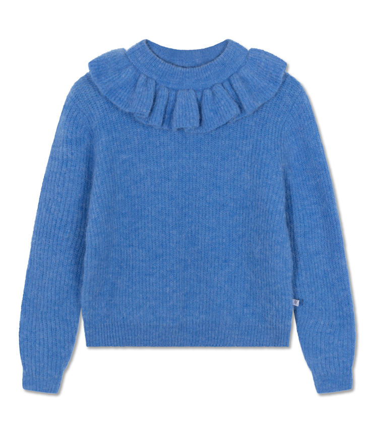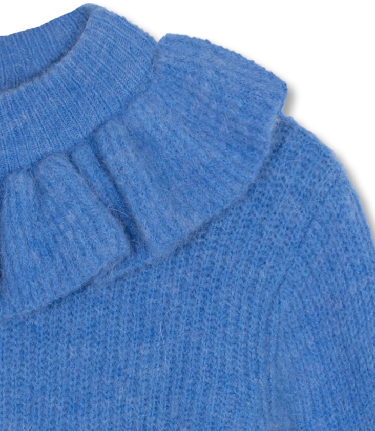 Weicher Strickpullover mit Rundhalsausschnitt mit Rüschenkragen, lange Ärmel.