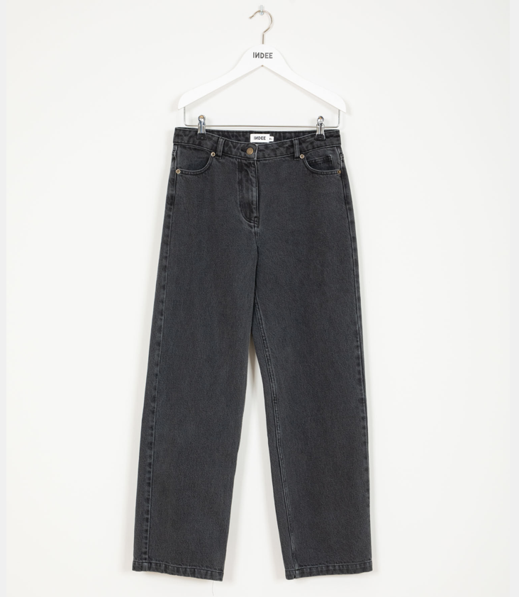 Denim-Jeans mit niedrigem Bund und geradem Bein. Zwei kleine Eingriffstaschen vorne, auf Rückseite eine aufgesetzte Tasche links, während rechts ein dunkler Kontrast in Form einer Tasche ist, mit dezenter Logostickerei. Gurtschleifen.